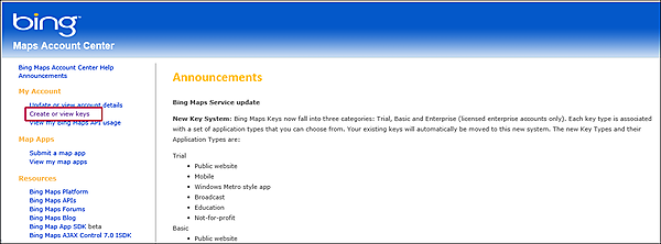 Bing Mapsを使用するには下記URLのBing Maps Account Centerに行って専用のライセンスキーを取得する必要があります。