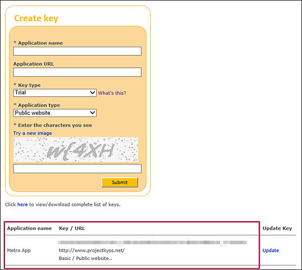Create keyの画面が表示されますので、必要な項目を入力してSubmitしてください。筆者は既にキーを持っていますので、下記にキーが表示されています(図16)。Key typeはBasicとなっています。BasicでPublic websiteの場合は、「アプリケーションが制限なしに利用され、500,000 のトランザクションの任意の種類の 12 ヶ月の期間内を超えない、公開ウェブサイトです。」となっているようです。