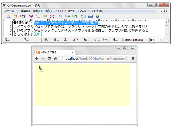 ドラッグ&ドロップできるのは、ブラウザ(ページ)内部の要素ばかりではありません。他のアプリからドラッグしたテキストやファイルを取得し、ブラウザ内部で処理することもできます。