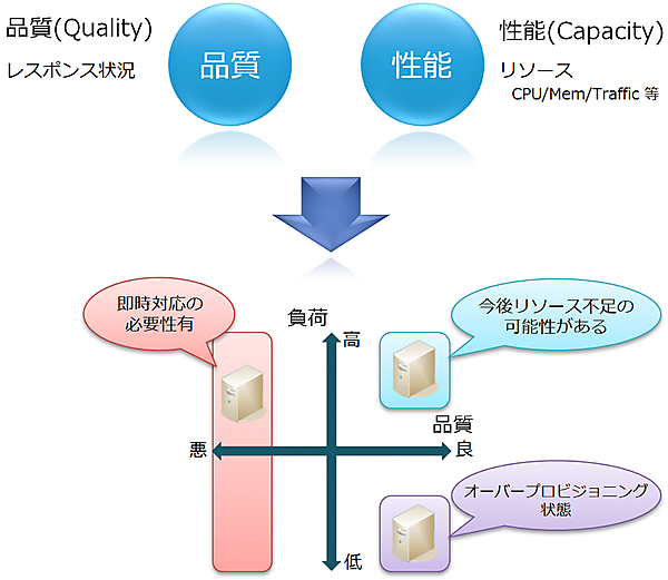 そこで、ユーザー視点での「品質」についても日々の運用監視作業のなかに含めていくことが重要になる。この両方の情報を常時収集し、突き合わせて分析することで、単純な死活監視だけでは得られないシステムのリアルな情報を把握することが可能だ。たとえば、「品質は要求レベルを満たしているが、リソースが逼迫しつつある」という状況であれば、今後リソース不足に陥る可能性が高いと判断できるだろう。逆に、「満足できるレベルの品質を維持するために消費しているリソースがごく少ない」のであれば、それはそのサービスに対するリソース割り当てがオーバープロビジョニング状態になっている可能性が疑われる。この場合は、余剰なリソースを開放することで他のサービスに回すことができるなど、より効率的な運用が可能になる余地があるわけだ。