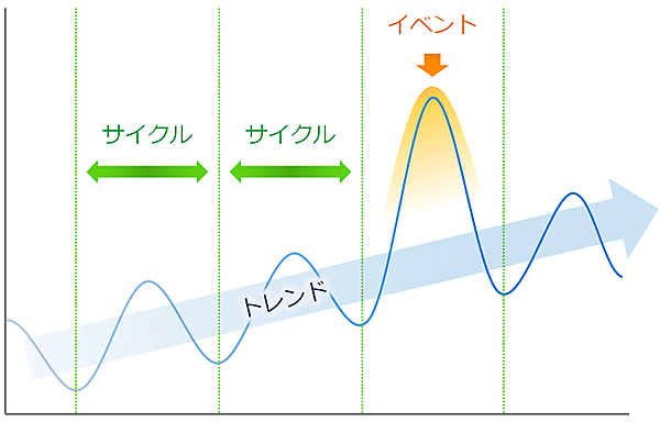単にある性能指標のグラフを眺めているだけでは、その意味するところを読み取るのは難しい。そこで、まずは時系列的な変化に着目してみよう。ここで我々が提唱するのは、グラフの波形を「サイクル」「イベント」「トレンド」といった観点で分析することだ。サイクルは文字通りの周期性のことだ。たとえばリソースの使用量が毎日同じような周期で変動する場合、これは負荷自体が周期的に変動していることの反映だろう。