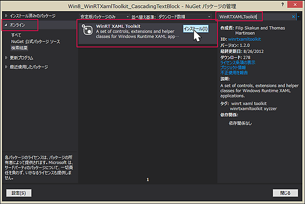 表示される画面の左に表示されている、「オンライン」を選択し、検索欄にWinRTXAMLToolkitと入力します。するとWinRT XAML Toolkitの〔インストール(I)〕画面が表示されますので(図5)、インストールをクリックします。