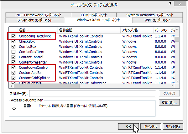 するとWinRT XAML Toolkitに含まれるコントロールが表示されチェックが付きますので、〔OK〕ボタンで閉じます(図9)。このpackagesフォルダーはソリューションエクスプローラー上には表示されていません。