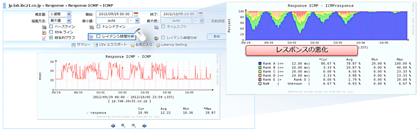 ここで、本社ネットワーク機器のレスポンス状況をグラフ表示してみると、おおよその現状がつかめ、実際にレスポンスタイムが増大傾向にあることが分かる。