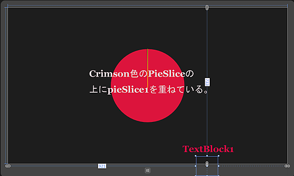 最初のPieSliceコントロールのFillにCrimsonを指定して赤系統色で塗りつぶし、WidthとHeightに360を指定します。これで円が表示されます。