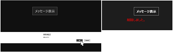 画面上には[メッセージ表示]というボタンが1個配置されています。このボタンをクリックすると、「削除しますか?」という削除確認のメッセージが表示されます。[OK]と[Cancel]ボタンが表示されますので、どちらかを選択します。[OK]を選択すると「削除しました。」が表示され、[Cancel]をクリックすると「中止しました。」と表示されます(図1)。