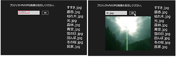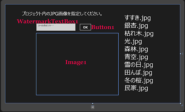 画面上には、プロジェクト内に配置した画像のファイル名を入力するWatermarkTextBoxとButtonコントロールアが配置されています。WatermarkTextBoxからフォーカスが離れた時は、「ファイル名を入力・・・」という透かし文字が表示されます。WatermarkTextBoxにフォーカスが移ると、この透かし文字は消えて、ファイル名の入力を受け付ける状態になります。右にファイル名の一覧が表示されていますので、任意のファイル名を入力すると、Imagesフォルダ内の画像が表示されます(図3)。