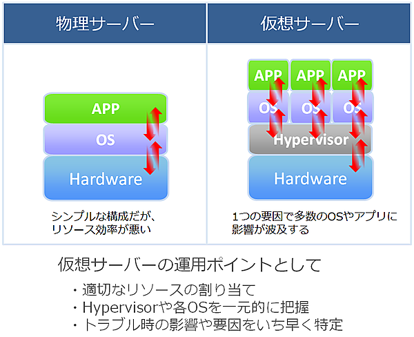 プロセッサ数はハードウェアの更新などの際に検討するものであり、日々の運用においてはさほど気にする必要はなかった。しかし、仮想化環境では仮想サーバに対するプロセッサ割当量は任意に変更できるため、設定が適切かどうかを管理する必要があり、リソース利用の効率化という観点からは、負荷状況に応じてこまめに割り当て変更を行うことも求められる可能性がある。他にも、メモリやストレージ、各種I/Oなど、コンピューティング・リソースすべてが仮想化されることで、物理的実体と仮想化されたリソースの両方を適切に監視していく必要があるため、運用管理対象が増大するのである。