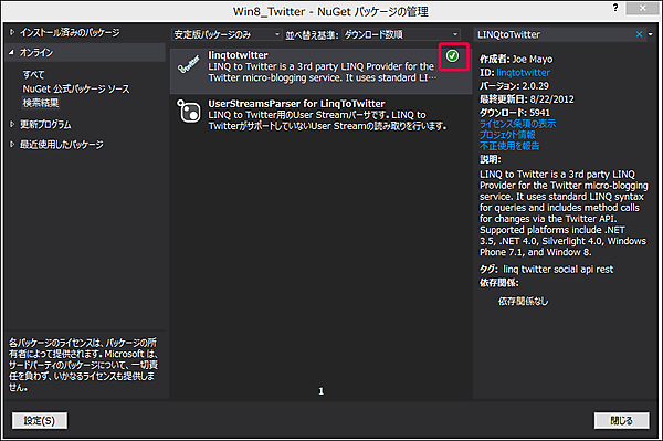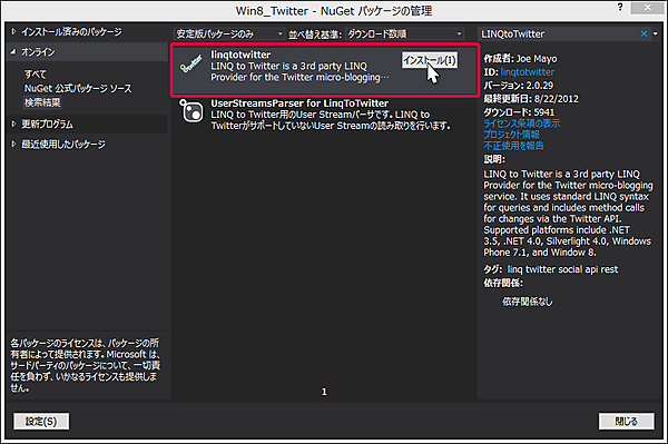 表示される画面の左に表示されている、「オンライン」を選択し、検索欄にLINQtoTwitterと入力します。するとlinqtotwitterの〔インストール(I)〕画面が表示されますので(図3)、インストールをクリックします。