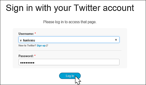 上記サイトにアクセスすると、UsernameとPasswordの入力を求められます。Twitterにアクセスするために登録しておいた情報を入力しください。筆者の情報を入力してみました(図6)。
