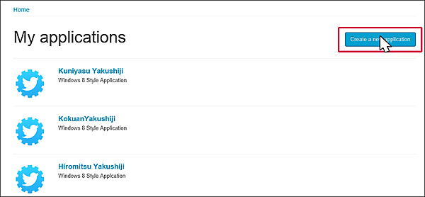 Loginをクリックします。すると筆者の場合はすでに何件かアプリケーションを登録していますので、その一覧が表示されます(図7)。このリンクをクリックすると、「CONSUMER_KEY」、「CONSUMER_SECRET」、「ACCESSTOKEN」、「ACCESSTOKENSECRET」が表示されます。これらの情報をプログラムの中で使用します。新規に登録する方は、右隅上にある[Create a new application]をクリックします。