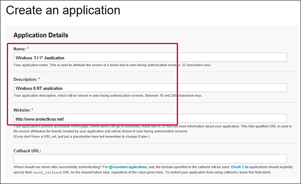 では、[Create a new application]をクリックしてアプリケーションを作成してみましょう。クリックして表示される画面に必要な情報を入力します(図8)。入力したら「Developer Rules of the Road」の「Yes,I agree」にチェックを付け、スパム防止用の文字を入力します。一番下にある[Create your Twitter application]ボタンをクリックします。