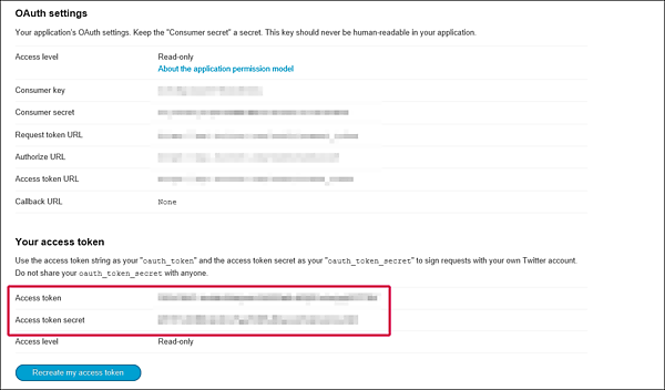 この時点での、これらの、「CONSUMER_KEY」、「CONSUMER_SECRET」、「ACCESSTOKEN」、「ACCESSTOKENSECRET」を控えておいてください。プログラムの中で使用します。