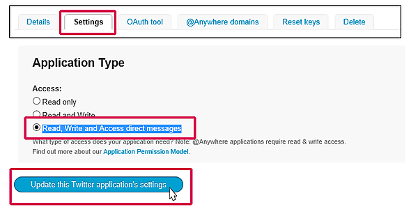 次に、「Setting」タブをクリックして、「Application Type」のAccessを指定します。デフォルトではReadonlyにチェックが付いていますので、「Read, Write and Access direct messages」にチェックを付けます。最後に一番下にある[Update this Twitter application’s setting]ボタンをクリックします(図11)。