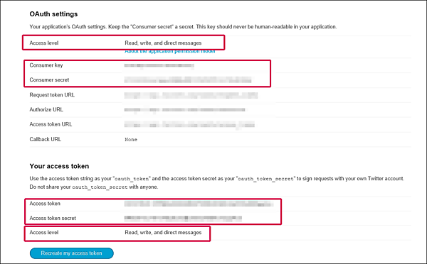 これで、Application Typeは「Read,Writeasd Access direct message」になりましたが、access tokenがReadonlyのままになっています。そこで、「Setting」の中で、[Recreate my access token]をクリックします。するとAccess levelがRead, write, and direct messagesに代わります。