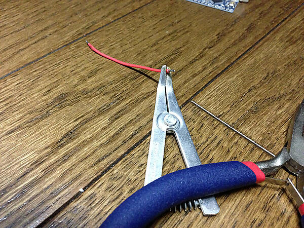 用意できたら、導線の両側を5mmほどむき出しにします。そこに、予め軽く半田を流しこんでおきます。