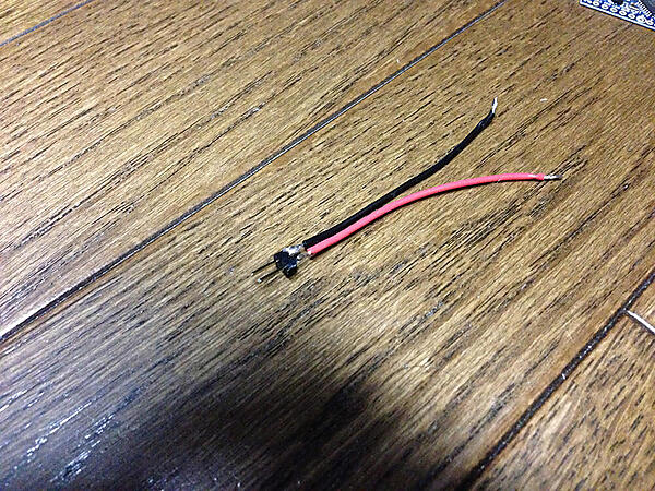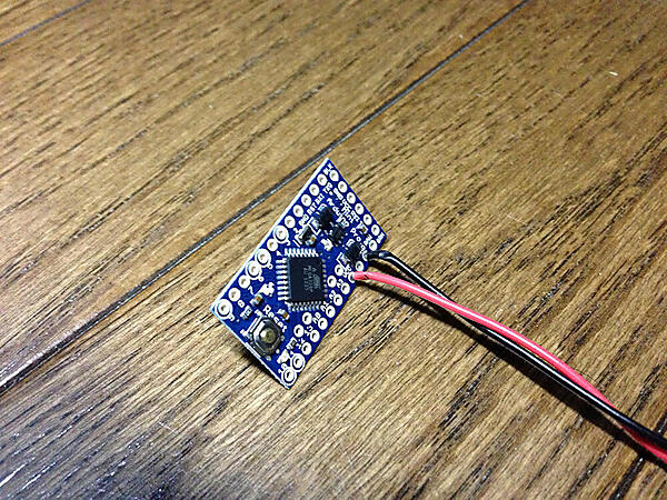 このパーツが出来たら、Arduino Pro Miniに半田付けします。赤いラインを右のVccに、黒いラインをGNDに繋いでください。上のVccとGNDはシリアル通信用なので注意してください。