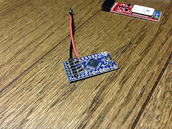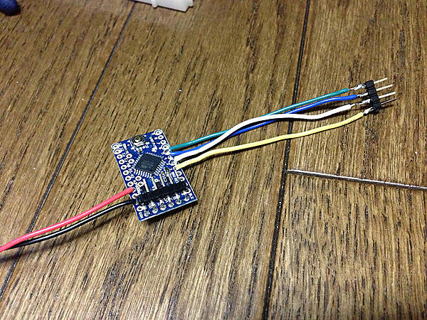 これをArduino Pro Miniに半田付けします。前回で作成したプロトタイプでは10, 11, 12, 13ピンを使っていましたが、ここでは2, 3, 4, 5ピンに変更します。これは、Arduino Pro Miniとミニ四駆の機体を考えた変更です。