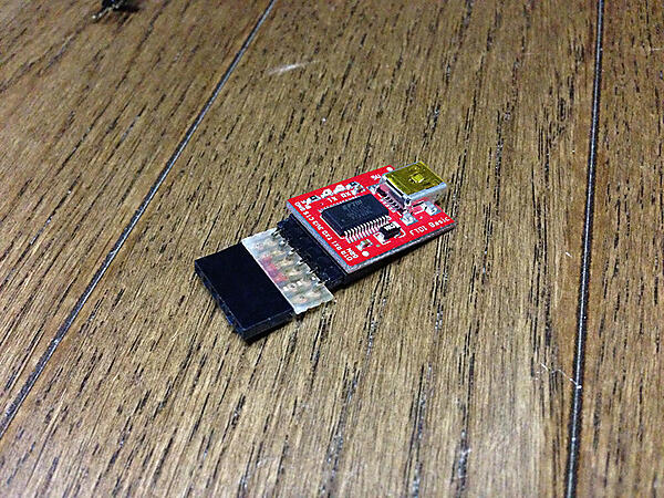 動作確認するためにはプログラムを転送する必要があります。しかし、Arduino Pro MiniにはUSBポートが存在しません。そのため、USBシリアルアダプタを利用します。これをArduino Pro Miniのシリアルポートに繋ぐことで、プログラムを転送できるようになります。