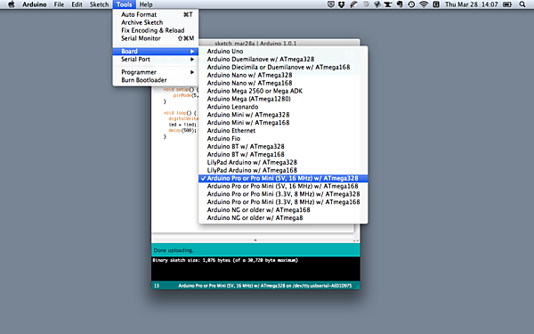 転送するに際して、Arduino IDEの設定を変更する必要があります。メニューから Tools > Board > Arduino Pro or Pro Mini (5V) ATmega 328 を選択します。