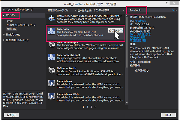 表示される画面の左に表示されている、「オンライン」を選択し、検索欄にFacebookと入力します。するとFacebookの〔インストール(I)〕画面が表示されますので(図1)、インストールをクリックします。