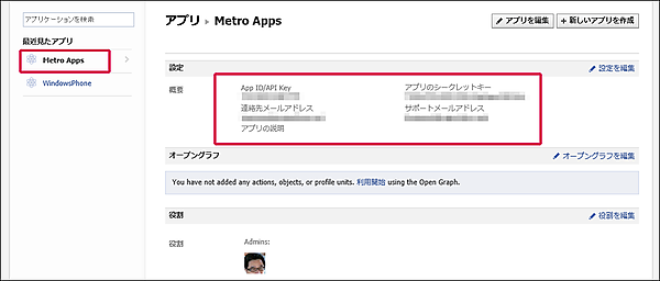 上記サイトにアクセスすると、私の場合はすでに、Windows PhoneとMetro Appsというアプリケーションを登録していますので、「設定」内に「App ID/API Key」や「アプリのシークレットキー」が表示されています(図3)。
