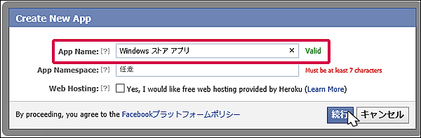 「Create New App」の画面が表示されますので、「App Name」を入力します。ここでは「Windows ストアアプリ」と入力して[続行]をクリックします(図4)。