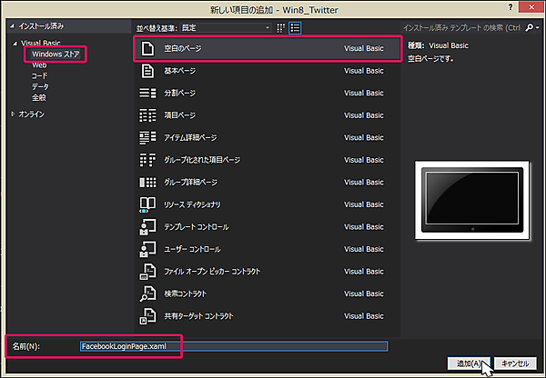 VS2012のメニューから「プロジェクト(P)/新しい項目の追加(W)」と選択して「Windows ストア」の「空白のページ」を選択します。「名前(N)」には、FacebookLoginPage.xamlと指定します。[追加(A)]ボタンをクリックします(図6)。