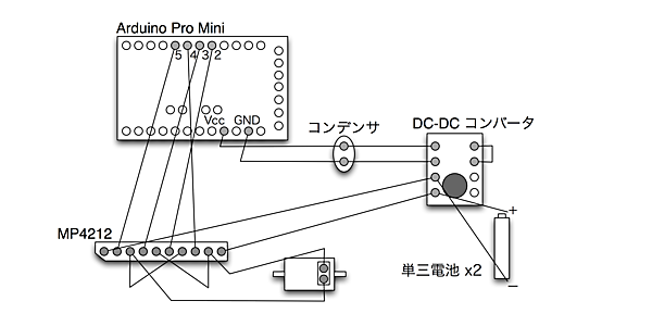 これは第6回の記事「ミニ四駆の遠隔操作を実現しよう!- プロトタイプ編」で紹介した回路のArduino Pro Mini版です。詳しい説明はそちらを御覧ください。続いて、次のプログラムを転送します。
