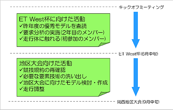 2012年度は「ET West杯に向けた活動」と「地区大会に向けた活動」で期間を区切って活動しました。初参加のメンバーが比較的多く、ET West杯を目標に掲げることで早い時期に走行体の特徴を実感してもらいたかったためです。また、走行可能な走行体をいったん作り終えることで、地区大会に向けて気づいた点を改善するという狙いもありました。