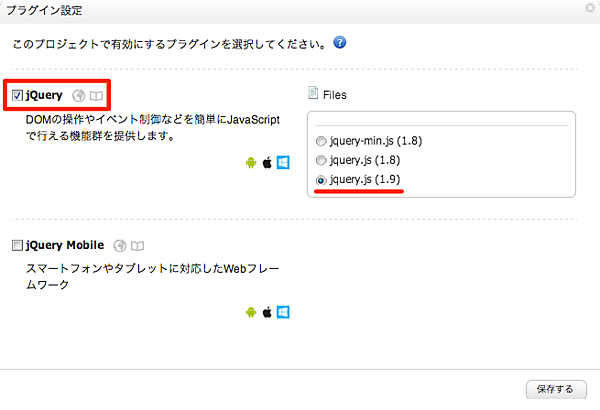 今回は執筆時点での最新版である jquery.js (1.9) を選択しましたが、今回のサンプルを試す範囲ではどのバージョンを選んでも動作に支障はありません。画面4のように設定を行ったら、「保存する」をクリックして保存してください。