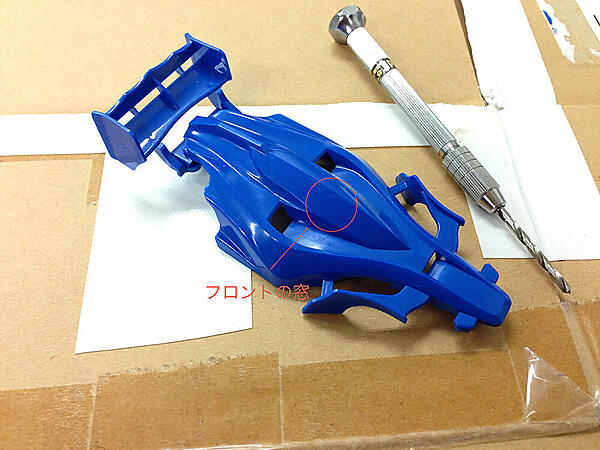 全ての穴が空いたら、ニッパーで穴同士をつなげます。こうすると、フロントの窓を取り外すことができます。