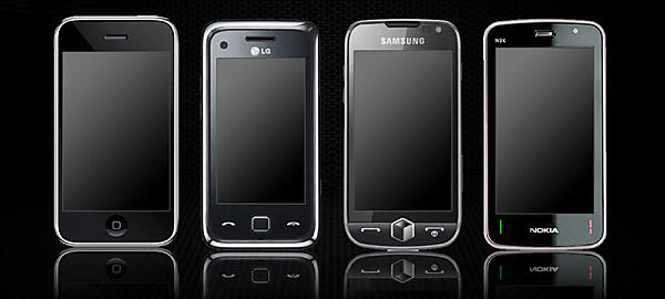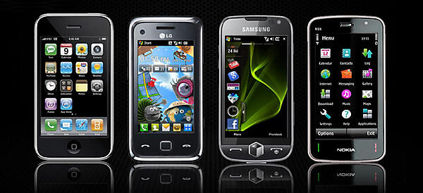 図1は、現在流通しているタッチ式のスマートフォンです。幾つもの種類がありますが、どれも同じような形をしているため、外見だけではこれらの機器がどこのメーカーのものであるか、一目で見分けるのは難しいでしょう。