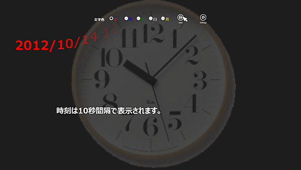 このサンプルでは時刻は10秒間隔で表示されます。起動すると10秒のカウントダウンが始まり(図2)、0になるとアニメーションを伴って時刻が表示されます(図3)。時刻の文字色はSettingsアイコンから色を選択することができます。Saveアイコンで保存すると、色情報は保存されますので、次回起動時にも設定した色で時刻が表示されます(図4)。