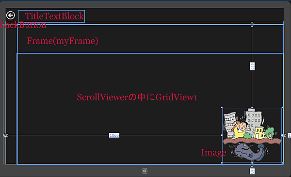 ツールボックスからデザイン画面上にTextBlockコントロールを1個、ScrollViewerコントロールを1個配置し、その子要素としてGridViewコントロールを1個配置します。