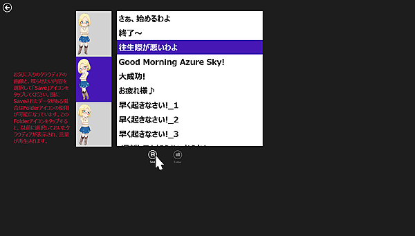 まず、気に入ったクラウディアを選択し、喋らせたい言葉を選択します。[Save]アイコンの使用が可能になりますので、アイコンをタップします(図1)。