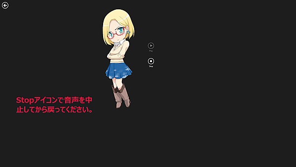 左隅上の戻る(←)アイコンをタップして最初の画面に戻る場合は、必ず[Stop]アイコンでお喋りを停止してから戻ってください。データはXMLで保存されます。