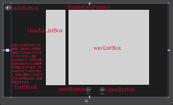 <TextBlockHorizontalAlignment="Left" Height="345" Margin="62,325,0,0" TextWrapping="Wrap" Text="お気に入りのクラウディアの画像と、喋らせたい内容を選択して「Save」アイコンをタップしてください。既にSaveされたデータがある場合はFolderアイコンの使用が可能になっています。このFolderアイコンをタップすると、以前に選択しておいたクラウディアが表示され、言葉が再生されます。" VerticalAlignment="Top" Width="266" FontFamily="Meiryo UI" FontSize="24" Foreground="Crimson"/>■(7)