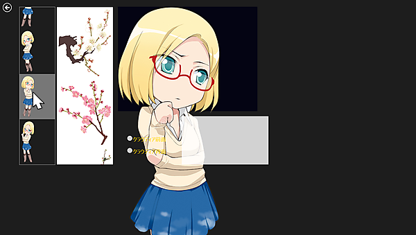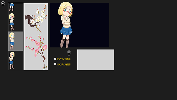 <RadioButton x:Name="frontClaudiaRadioButton" Content="クラウディア前面" HorizontalAlignment="Left" Height="51" Margin="581,621,0,0" VerticalAlignment="Top" Width="200" GroupName="claudia" FontFamily="Meiryo UI" FontSize="24" Foreground="Gold"/>■(8)