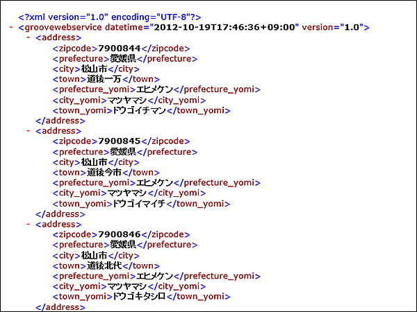 Formatにはxmlを指定していますので、返される結果はXMLデータとなります。例えばWatermarkTextBoxに「愛媛県松山市道後」と入力すると図6のようなXMLが返されます。