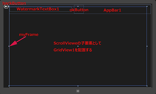 ItemTemplateに(2)で定義したGridViewTemplateをStaticResourceで参照させます。 - (4)名前がbackButtonという