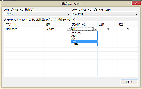 「プラットフォーム」がAny CPUになっていますので、プルダウンメニューから、該当するプラットフォームを選択します。筆者の環境では×86を選択する必要がありました(図11)。