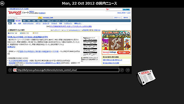 ページが表示されると、上記URLのデータを読み込んで、当日の国内ニュースの一覧が、タイルで表示されます(図1)。タイルをタップするとブラウザが起動して、そのニュースに該当する内容を見ることができます(図2)。