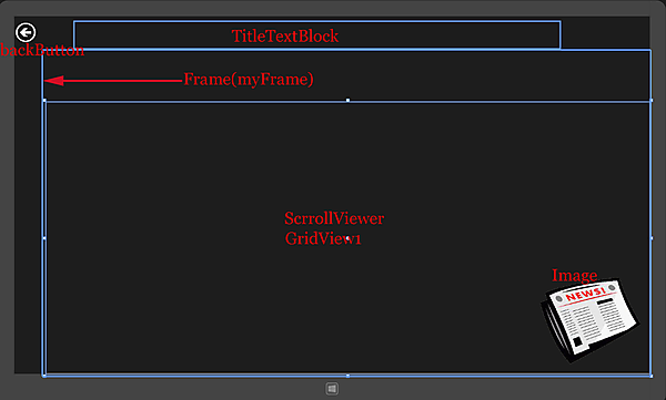 ツールボックスからデザイン画面上に、Imageコントロールを1個、TextBlockコントロールを1個、ScrollViewerコントロールを1個配置し、子要素としてGridViewコントロールを1個配置します。Frameコントロールを1個配置し、Buttonコントロールを1個配置します。