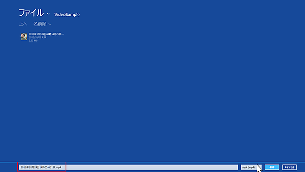 すると動画ファイルを保存するためにファイルピッカーが起動しますので、自動的に作成されたVideoSampleというフォルダに保存してください。ファイル名も自動的に付けられます。[保存]ボタンをタップしてください(図2)。
