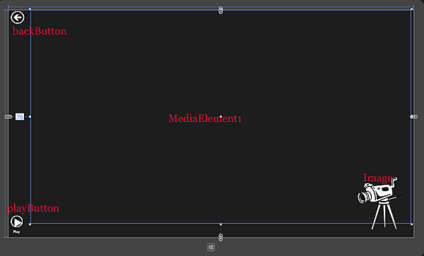 ツールボックスからデザイン画面上に、Buttonコントロールを2個、MediaElementコントロールを1個、Imageコントロールを1個配置します。