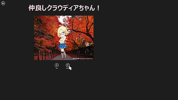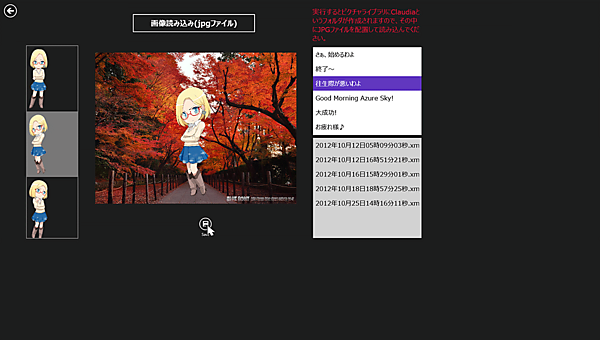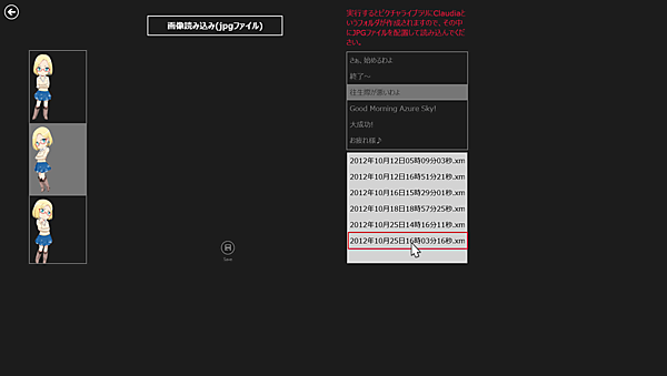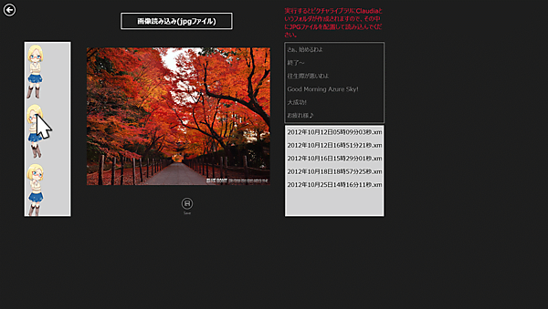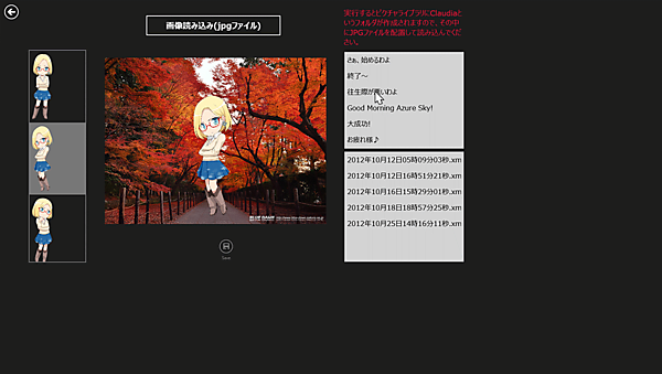 このアプリを起動すると、ピクチャライブラリ内にClaudiaというフォルダが作成されますので、クラウディアと一緒に配置する画像は、必ずこのClaudiaフォルダ内に配置してください。ほかのフォルダに配置すると動作しませんのでご注意ください。