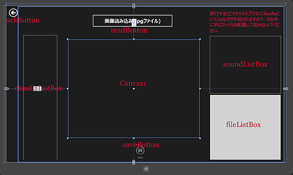 <TextBlock HorizontalAlignment="Left" Height="120" Margin="994,23,0,0" TextWrapping="Wrap" Text="実行するとピクチャライブラリにClaudiaというフォルダが作成されますので、その中にJPGファイルを配置して読み込んでください。" VerticalAlignment="Top" Width="346" FontFamily="Meiryo UI" FontSize="22" Foreground="Crimson"/>■(7)