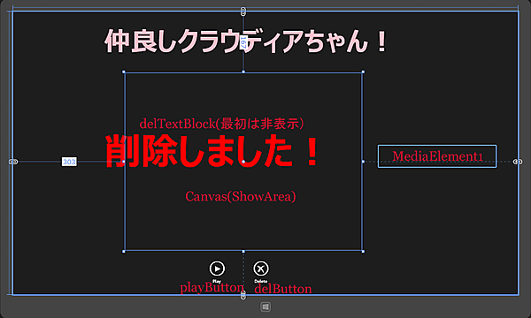 <TextBlock x:Name="delTextBlock" HorizontalAlignment="Left" Height="125" Margin="246,310,0,0" TextWrapping="Wrap" Text="削除しました!" VerticalAlignment="Top" Width="730" FontFamily="Meiryo UI" FontSize="100" FontWeight="Bold" Foreground="Red" Visibility="Collapsed"/>■(6)
