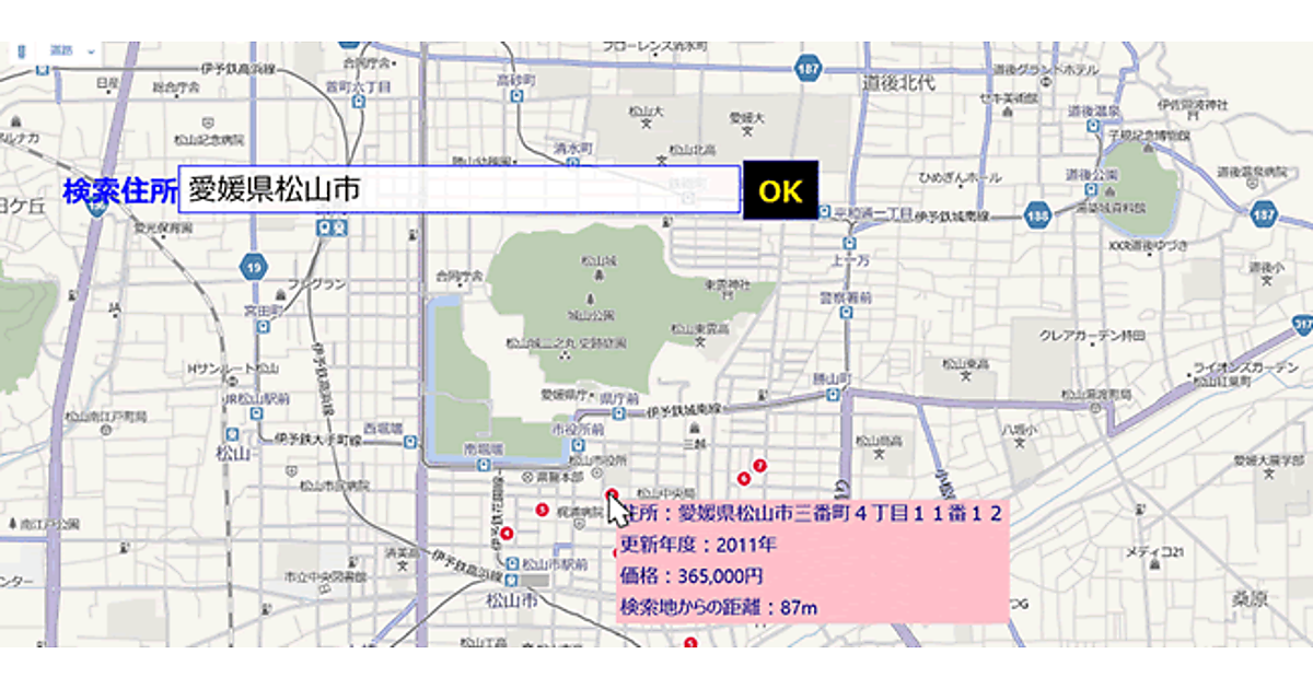 今回は、「地価公示Api」を使います。住宅を購入したりする際に参考となる地価公示価格を、入力した住所近辺から表示するサンプルです。
